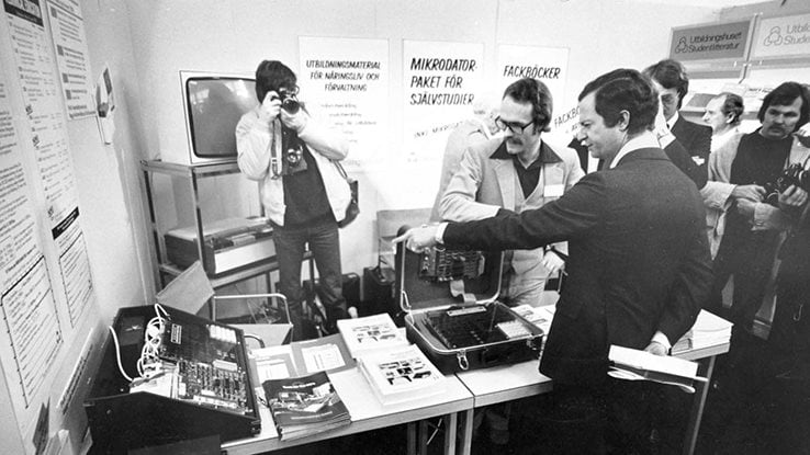 Studentlitteratur visar mikrodatorer på mässan Datakraft i Malmö 1979. Kungen är en av gästerna och välkomnas av kungssången som programmerats på en av datorerna.