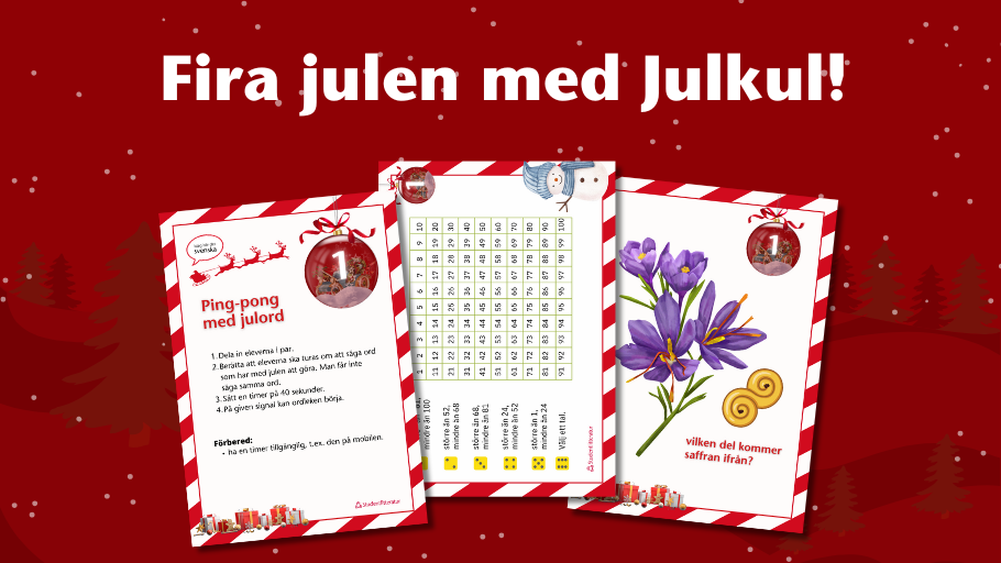 Inför varje advent bjuder vi på roliga och inspirerande Julkul-material för klassrummet. Måndagen före varje advent släpper vi fyra nya, kostnadsfria aktiviteter: ett i svenska, engelska, matematik och ett i NO eller SO.