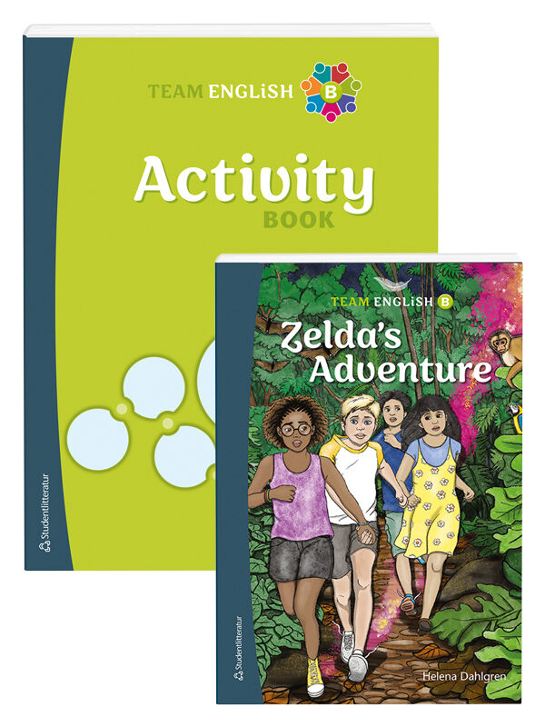 Team English är ett nytt basläromedel för åk 4-6 med en riktig skönlitterär bok och sju spännande teman där eleverna läser och utvecklar sina engelskkunskaper tillsammans! I Team English B Elevpaket ingår läseboken Zelda’s Adventure i lättläst version med digitalt läromedel och en Activity Book. Team English huvudfokus är den gemensamma läsupplevelsen och tematiskt arbete som genomsyras av kooperativt lärande. Med lockande fantasyberättelser på två olika nivåer, och en Activity Book som verkligen aktiverar eleverna i alla färdigheter, lär sig eleverna mer engelska tillsammans. Läsebok – Zelda’s Adventure Zelda’s Adventure är en fristående fortsättning på Sam’s Secret. Den här gången tar äventyret plats på de engelskstalande öarna Trinidad & Tobago, där Zelda står i centrum. I boken tar de fyra vännerna sig an ett nytt spännande mysterium med familjehemligheter och illegal handel med vilda djur. Boken är skriven av Helena Dahlgren, känd för sina fängslande ungdomsromaner, och kombinerar en engagerande handling med karaktärer som eleverna kan relatera till. Precis som vid tittandet på en spännande tv-serie skapar berättelsen en stark vilja hos eleverna att fortsätta läsa och ta reda på vad som händer härnäst. Boken är rikt illustrerad med engagerande bilder som stödjer elevernas läsförståelse och gör berättelsen mer levande. Dessutom finns ordlistor längst ner på sidan som underlättar läsningen och stöttar inlärningen av nya fraser och uttryck. Eleverna läser 21 kapitel fördelade på 7 units, där varje unit avslutas med ett hörförståelsekapitel utifrån en stor bild som håller elevernas nyfikenhet vid liv från början till slut. Digitalt läromedel – Zelda’s Adventure I det digitala läromedlet som medföljer finns ljud, filmer och övningar kopplade till läsebokens berättelse. Där ingår: • Read & Listen – inläsningar utav hela berättelsen - både originalet och den lättlästa versionen • Words – ordövningar på de glosor som förekommer i berättelsen • Listen & Answer – hörförståelsefrågor till berättelsen • Read & Answer – läsförståelsefrågor till berättelsen • Peer readers – korta filmer där läskompisar, som redan har läst berättelsen, delar med sig av sina tankar, frågor och tips och agerar som läsande förebilder • Speak & Write – individuella uppdrag kopplade till läsningen som eleverna får lösa antingen skriftligt eller muntligt Fler uppgifter till boken, både kooperativa och för enskilt arbete, finns också i lärarpaketet. Activity Book I Activity Book finns texter för läsförståelse och hörförståelse, uppgifter för att tala och skriva samt grammatik- och ordkunskapsträning. I boken finns sju teman och varje tema handlar om en fiktiv huvudperson från the UK vilket ger eleven värdefulla realiakunskaper. Enskilt arbete varvas med kooperativt lärande i par, grupp eller klass där eleverna lär tillsammans och av varandra. Särskilt tyngd läggs vid talövningarna och att få alla elever att våga tala. Här är det kooperativa arbetet nyckeln till att eleverna får mycket taltid, stöd av uppgiften och de andra eleverna samt att de får prata i mindre grupper. Varje tema leder upp till en avslutande skrivuppgift som alla elever kan klara av. Temana och innehållet är i linje med det centrala innehållet för Lgr22 och tas också upp i läseboken Zelda’s Adventure. De sju teman som finns i Activity Book B är: •Weather & Seasons (Edinburgh, Scotland) • Nature & Animals (Inverness, Scotland) • Crime (Cardiff, Wales) • Sports (Birmingham, England) • Music (Liverpool, England) • Tourism & Traveling (London, England) • Myths & Legends (Belfast, Northern Ireland) Författaren till Activity Book är läraren Melissa Nilsson från Philadelphia som idag bor och undervisar i Sverige men har också studerat i Storbritannien. Activity Book B är skriven på brittisk engelska och eleverna får via de sju temana träffa sju fiktiva karaktärer och göra en resa genom sju olika regioner i the UK. Elevpaketets Activity book är en förbrukningsbok som eleverna skriver och ritar i. Den kan också köpas separat i 10-pack. Kooperativt lärande som metod Namnet Team English syftar på att läromedelsserien genomsyras av kooperativt lärande och laginsatser. Kooperativt lärande som metod är väl spridd i de svenska skolorna och har bevisats ha positiva effekter för såväl lärandet som motivation och inkludering. De flesta övningar i serien är upplagda så att eleverna får lära tillsammans och av varandra i par, grupp eller helklass. Bakgrundsinformation kring den kooperativa metoden samt allt extra underlag som behövs för de kooperativa övningarna ingår i lärarpaketet. Kooperativa uppgifter, grammatik- och ordträning inom sju olika teman finns i Team English B Activity Book. Pedagogisk flexibilitet Med Team English kan läraren välja olika sätt arbeta med läromedlet. Läsningen och arbetet med den skönlitterära boken kan varvas med tematiskt arbete i Activity Book. Antingen under en och samma lektion eller så kan veckans lektioner fördelas mellan dessa två. Det är också möjligt att arbeta med läseboken under en intensiv läsperiod så att eleverna får hänge sig åt fantasyberättelsens handling och ”sträckläsa” den eller låta ett tema från Activity Book uppta en egen längre period. Zelda’s Adventure – två versioner/nivåer I det här elevpaketet ingår den lättlästa versionen av Zelda’s Adventure. Den riktar sig till elever som siktar mot godkänt i engelska eller behöver mer stöd för att kunna gå vidare och läsa originalversionen. I den lättlästa versionen har textomfånget minskats till hälften utan att huvuddragen i berättelsen går förlorade. Texten är satt med kortare rader, större radavstånd och fler blankrader så att själva bokens sidantal är detsamma som i originalvers