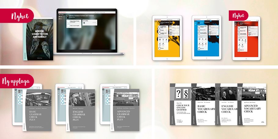 Basic Vocabulary Check är avsett för Engelska 5 i gymnasiets yrkesförberedande program och är ett enklare alternativ till English Vocabulary Check. English Vocabulary Check är avsett för Engelska 5 på gymnasiets studieförberedande program. I häftet övas över 1 000 av de ord som tillhör det centrala ordförrådet för kursen. Advanced Vocabulary Check är avsett för Engelska 6 på gymnasiets studieförberedande program. Häftet, som inleds med en diagnos, omfattar ca 750 ord som är ordnade alfabetiskt. Varje kapitel avslutas med en sida där orden övas i ett textsammanhang.