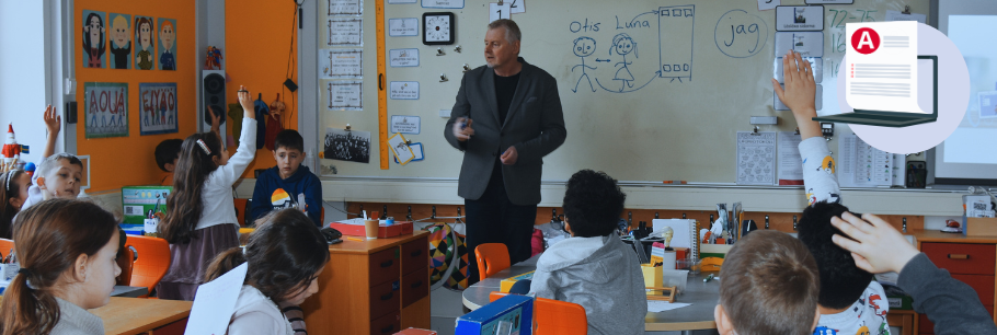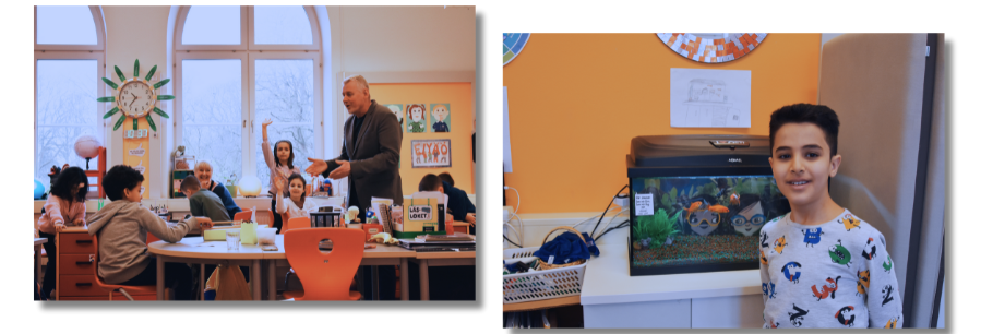 Torsten Bengtsson är författare till Krumelurkul, det läromedel i svenska som klassen använt sedan de började ettan. Och att mycket av elevernas vardag kretsar kring Otis, Luna och alla deras påhitt är tydligt genom allt från ordflätor och ordförrådsblad på tavlan till en gigantisk spindel i ett hörn. Ett av barnen visar stolt upp klassens akvarium, där guldfiskarna Sim, Sam och Sum bor, precis som hemma hos Otis.