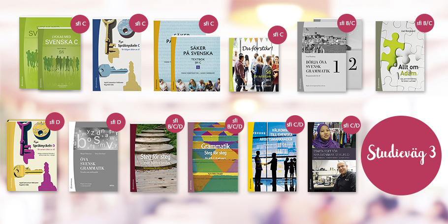 Här hittar du en översikt över vilka läromedel som passar studieväg 3 inom Sfi. Nedan kan du se vilka läromedel som passar till vilken kurs och Gers-nivå. Klicka på titlarna för att läsa mer om de olika läromedlena, prova de tillhörande digitala läromedlen och beställa kostnadsfria provexemplar.