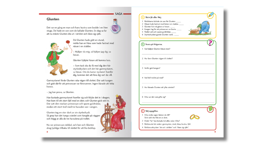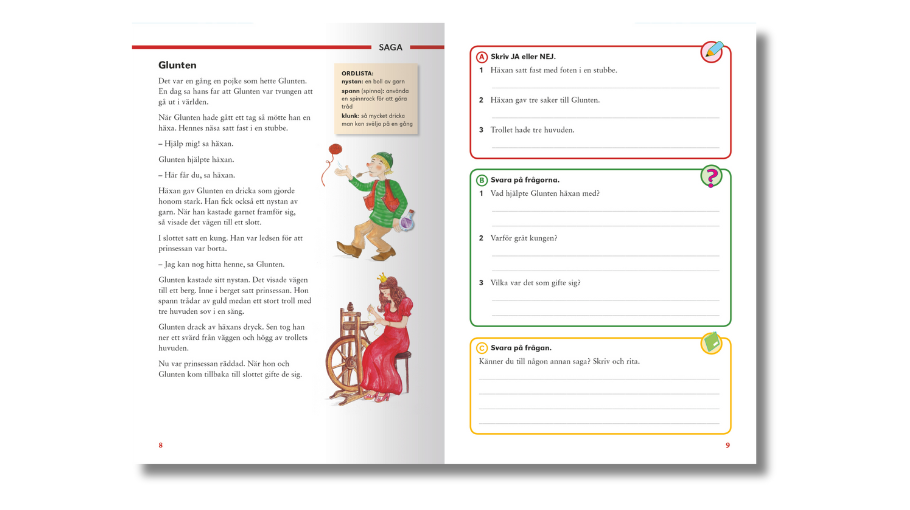 För att eleverna ska lyckas arbeta färdigt med uppgifterna är antalet frågor anpassade. Skrivutrymmet är utökat, vilket ger eleverna möjlighet att svara med hela meningar. Svaren till alla uppgifter skrivs direkt i boken och därmed har eleverna har alla sina svar samlade på en och samma plats.
