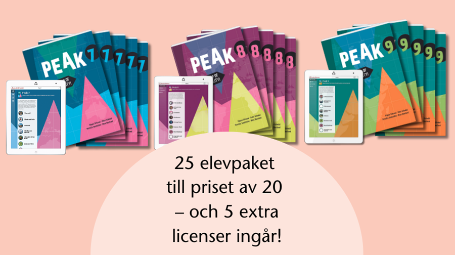 När du köper klasspaket med Peak 7, 8 eller 9 får du 25 elevpaket (tryckta böcker + digitala licenser) men betalar endast för 20 elevpaket – och dessutom ingår 5 extra licenser!