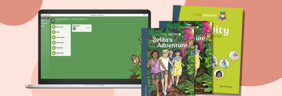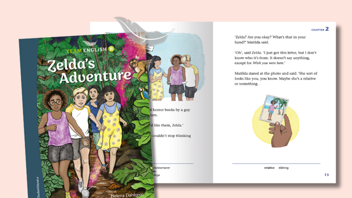 Zelda’s Adventure är den fristående fortsättningen på Sam’s Secret, även den specialskriven för Team English av författaren Helena Dahlgren. I boken får du följa Zelda och hennes vänner på ett nytt spännande äventyr i Trinidad & Tobago, där de möter både familjehemligheter och mysterier i en tropisk miljö. Precis som i Sam’s Secret presenteras vart tredje kapitel som ett stort och dramatiskt bilduppslag, och istället för att läsa får du lyssna på kapitlet. Ljudfilerna finns i det digitala läromedlet, som också innehåller självrättande läs- och hörförståelsefrågor, ordträning och inspirerande peer reader-filmer.